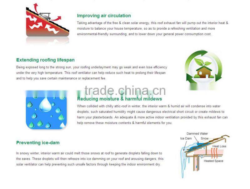 The initial installation purpose for such solar roof exhaust fan may be to take out heats from a residential house, and they have been widely used in pitch roofed buildings like villas. Besides villas, other structural buildings with flat roof have actually become great and new platforms to utilize such devices.