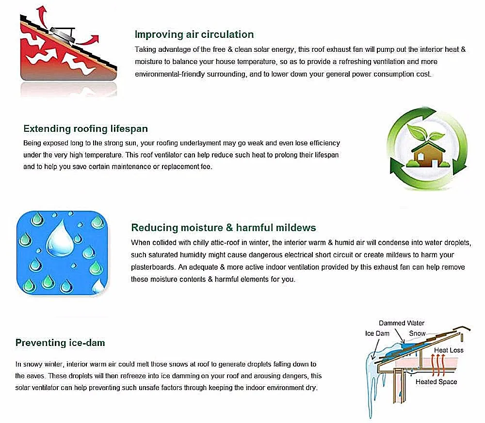 A: Solar vent fan is runs by solar power, taking advantage of the free & clean solar energy, this roof exhaust fan will pump out the interior heat & moisture to balance your house temperature, so as to provide a refreshing ventilation and more environmental-friendly surrounding.