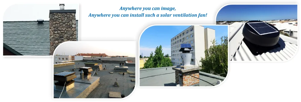 Our solar roof fan can be use in different building, as the above piecture you will see. When sun is shining in day time, the fan will be powered directly by its 12 watt solar panel.