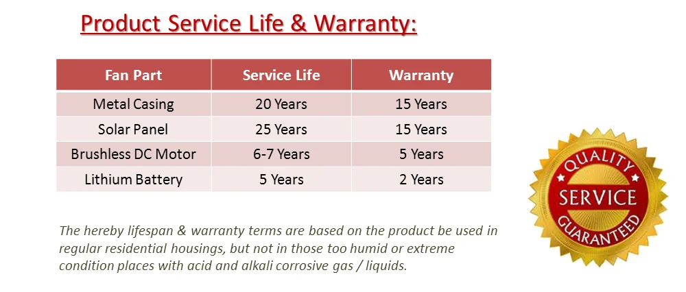 A separated 20W/ 30W /40W solar panel system whose back side is embedded with a compact lithium storage battery kit will connect to the fan host. The battery collects & stores energy at day time to support the fan work continuously after sunset.
