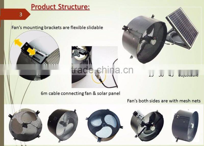 * the fan's mounting brackets are slideable & the solar panel's angle is adjustable 0°, 15°, 30°, 45°