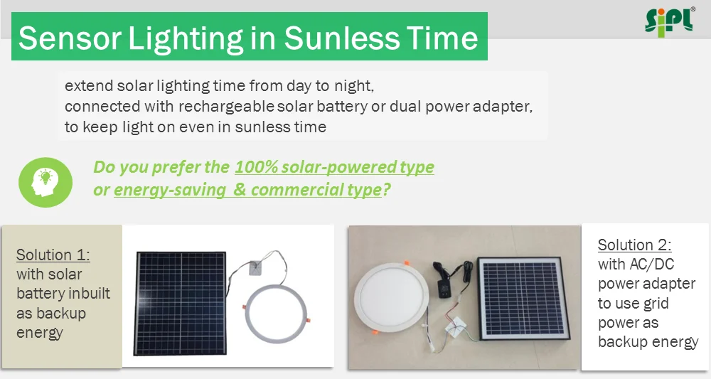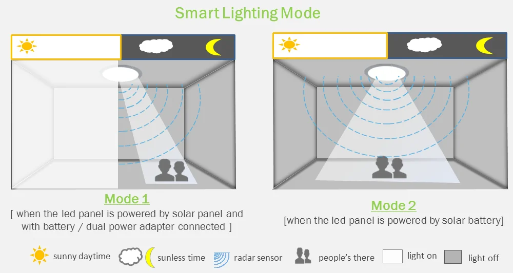 * Keep lighting by solar panel power in sunny day time, giving you the most natural lighting experience.* Intelligently lighting simply by lowest grid power in sunless time, with radar sensor design for more energy-saving and smart services.