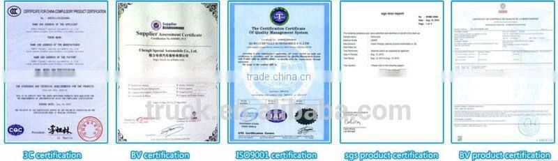Based on high quality and advanced technology, the leading varieties include more than 200 types of trucks such as water truck, garbage truck, fecal and sewage suction truck,refuse compactor, fuel tank, aerial platform, truck with crane, dump truck, van truck, trailers, fire-fighting truck, refrigerator truck, tractor, bulk cement truck, chemical liquid truck, concrete mixer truck, LPG tank, etc. All products have passed the ISO9001-2000 and t 3C(China Compulsory Certification) standard.