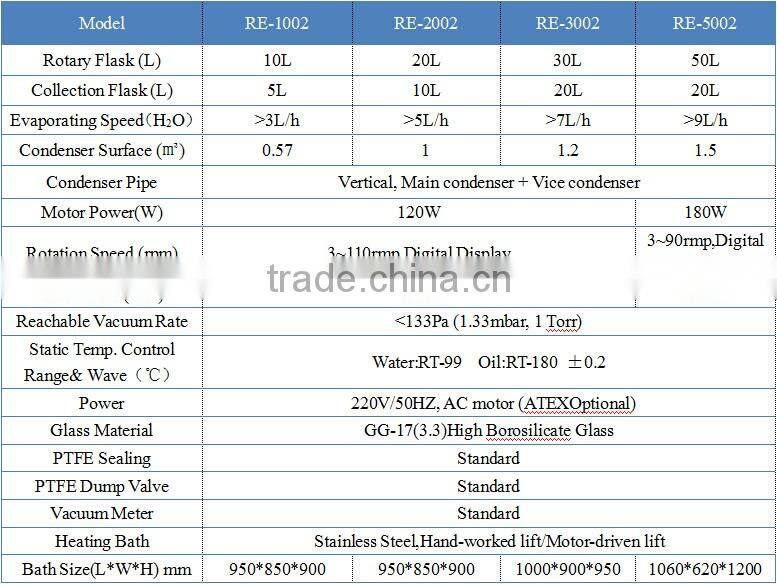 We have the rotary evaporator from 500ml to 50l (rotary flask volume), pls according your working requirements to choose suitable model and we can provide custom service.(such us explosion protection system configuration, Corrosion resistant framework, etc. )
