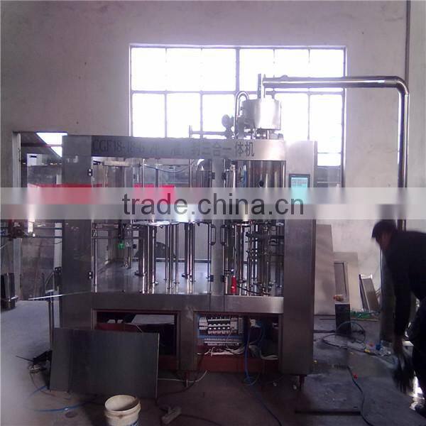 Features: 1.The machine is mainly used in the beverage filling operations. The three functions 2. This 3-in-1 monobloc machine is for fruit juice, tea beverage, etc. 3. Water bottling machine, it is a fully automatic and multi-functions 4. Direct connection technology is used between air conveyor and in-feeding 5. Neck-hanging technology is applied in bottle transportation. Instead of