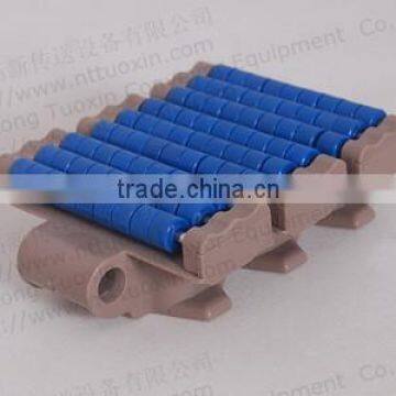 This plastic LBP chain is the solution to the pressure created between products and the conveying surface created by the accumulation of products. This is achieved by having a series of small width rollers which provides a stable conveying surface and enables the product to be handled without damage. however the chain still provides a positive forward motion.