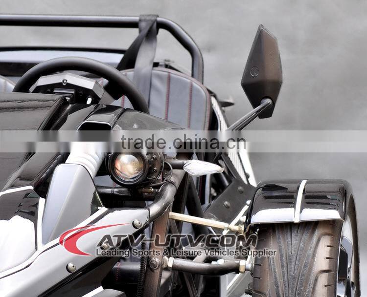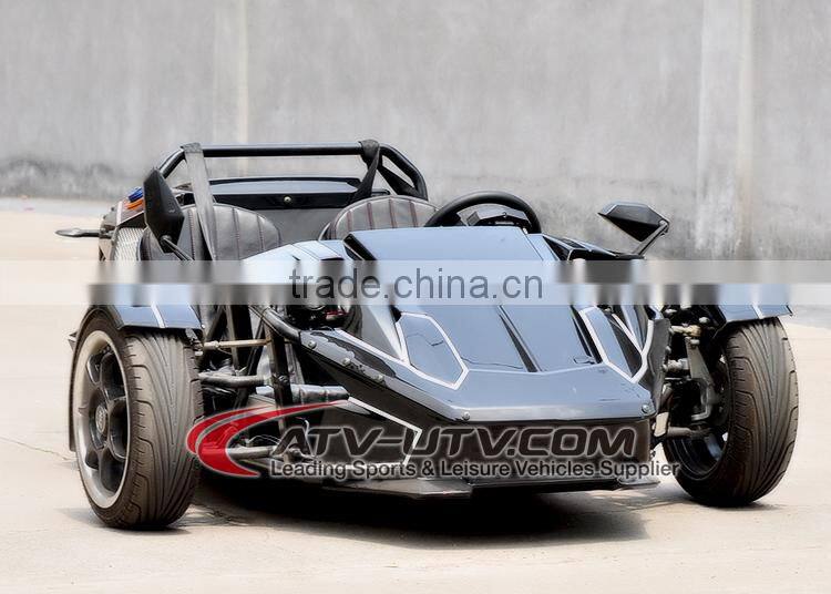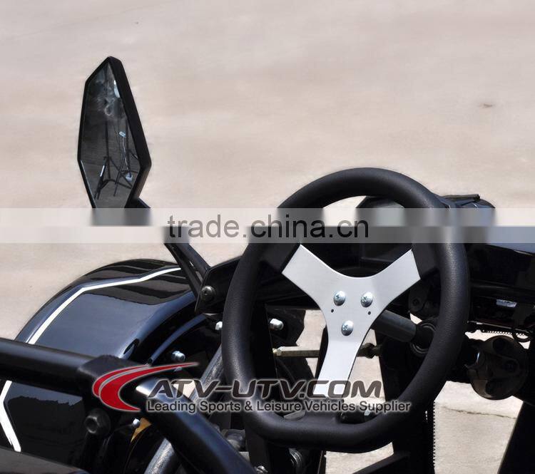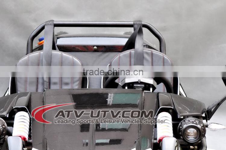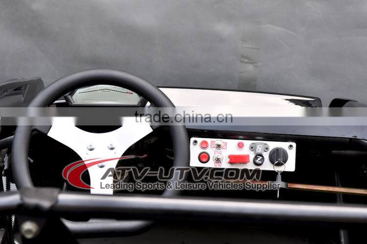 Engine: ZONGSHEN Type: single cylinder, water-cooling,4-stroke12HP, 2valve Transmission: 4 gears with one reverse gear,manual cluth Ignition mode: CDI Compression propor: 10.5:1 Power:16HP/7,500rpm Max.torque: 17N.m/6,000rpm Displacement: 250ml Start mode: electric Transmission mode: chain Min.ground clearance: 100mm Max.speed: 120km/h Full tank oil range: 200KM Vehicle frame color: Black Power source:12V,12AH Fuel tank capacity: 10L Product dimensions: 2650x1650x770MM Front wheels: 185/30-R14 Rear wheels: 270/30-R14 Break type(F/R): disc/disc Front hanging: double arm-swing Rear hanging: integra |