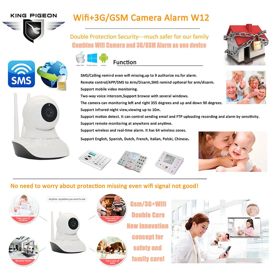 W12 Wifi+3G/GSM Camera Alarm adopts advance technology,it combine Wifi Camera and 3G/GSM Alarm as one device.It support both wifi and 3G/GSM,double protection security,should be a new innovation concept for safety and family care!
