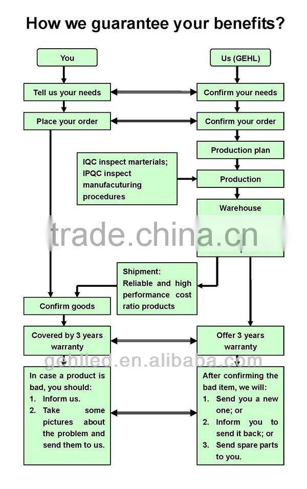A: Firstly, Our products are produced in strict quality control system and the defective rate will be less than 0.2%. Secondly, during the guarantee period, we will send new lights with new order for small quantity. For defective batch products, we will repair them and resend them to you or we can discuss the solution i ncluding re-call according to real situation.