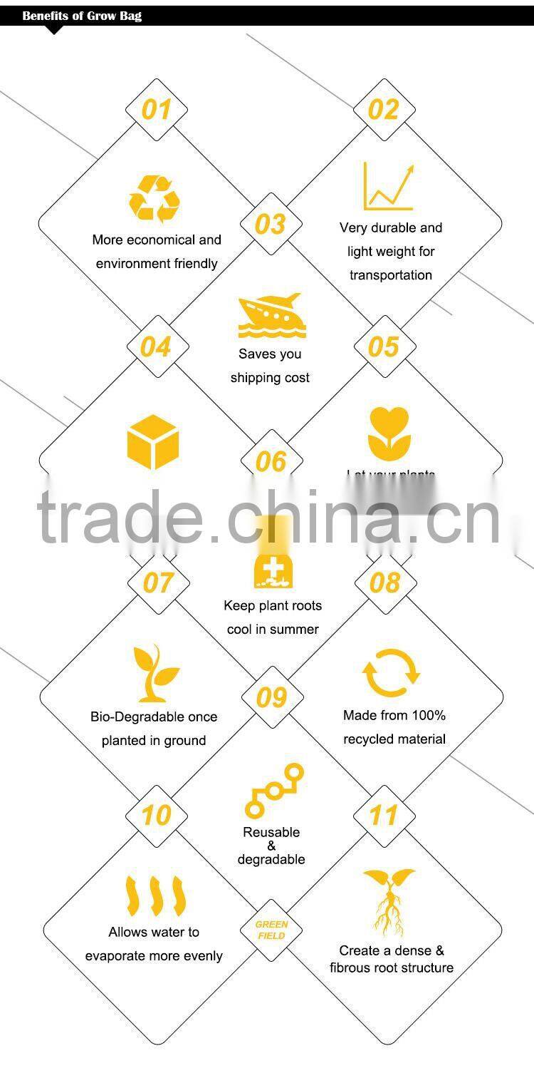Green Field is a manufacturer and supplier of bag items. Our product range are grow bag,wall planter bag, garden bag ,accessories bag etc.In our factory,we have experience workers , advanced technical equipment which we can make the high quality with competive price ,SO welcome to inquriy us !