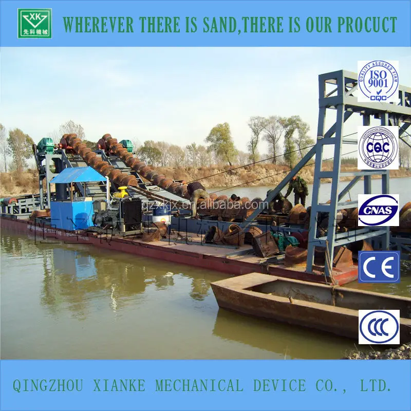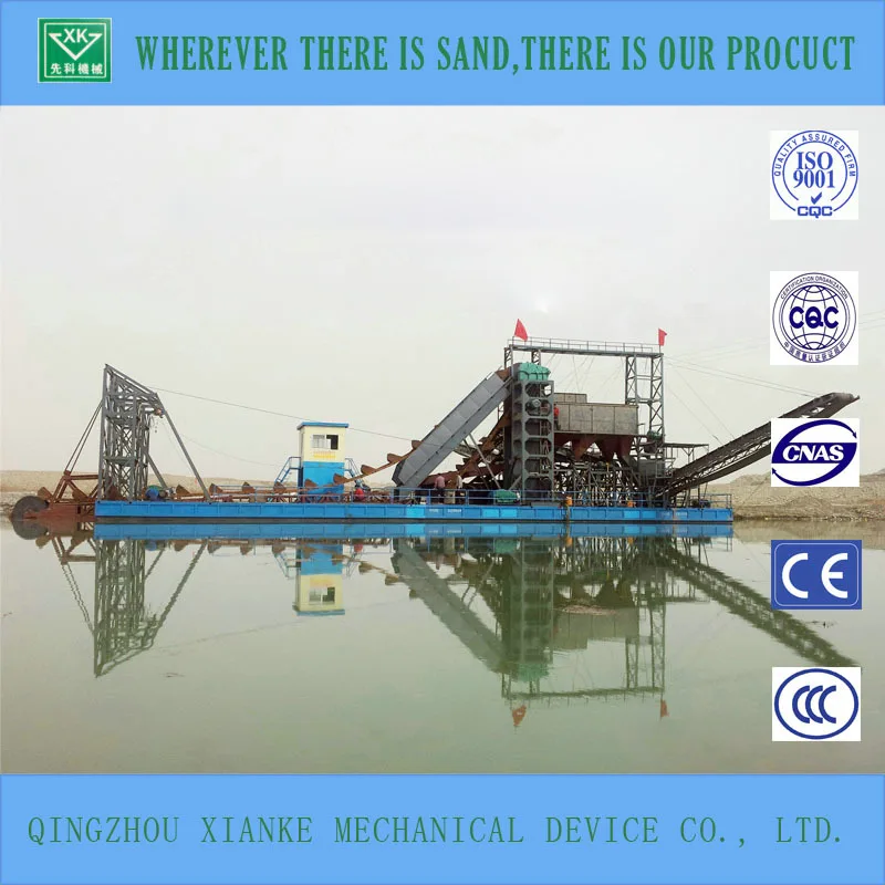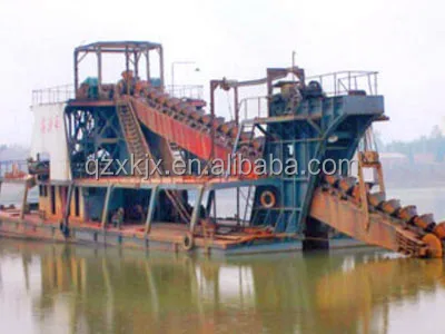 XKBD series bucket chain dredger have good ability to fit different kinds of geological condition. With the advantages of stable performance, long working life, little cost, high efficiency and little maintenance, bucket chain dredger is suitable for sand digging from river and lake. This kind of dredger can also be used in salt mining,offshore dredging,hard riverbed exploiting and channel cleaning. The pure sand after sieved and washed by the dredger is widely used i construction industry.