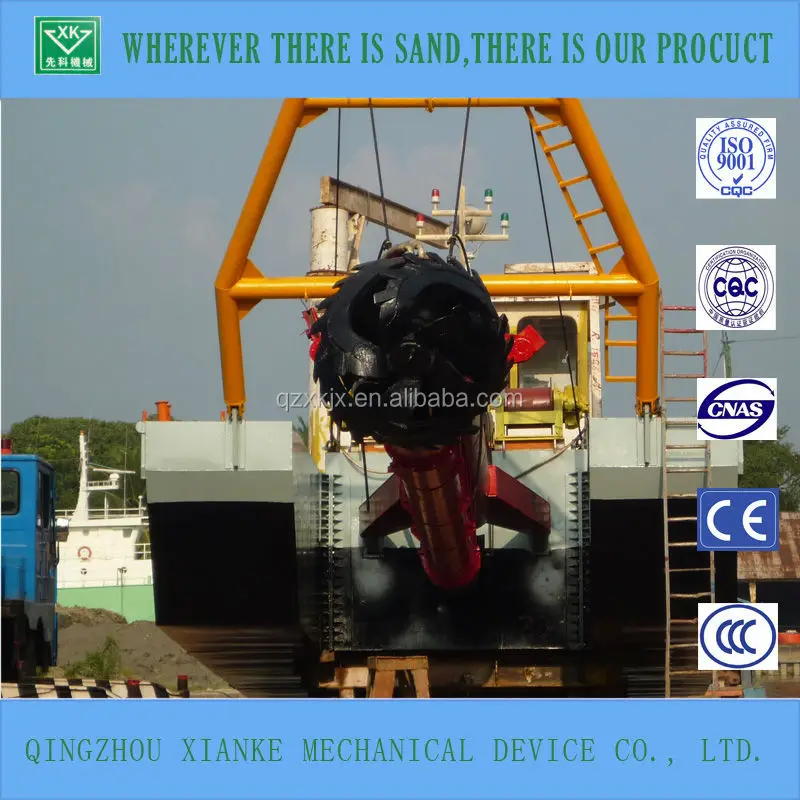 First the hydraulic cutter in the ladder cuts sediment below water, and makes it loosen then dredged sand moved by the rotated cutter mixes with water and form liquid medium.Then the sand liquid in the inner cutter blade and beside the marine pump suction functioned by the fluid power of sand pump, enters sand pump, meanwhile, get some energy, at last, it is discharged to the destination through discharge pipe.