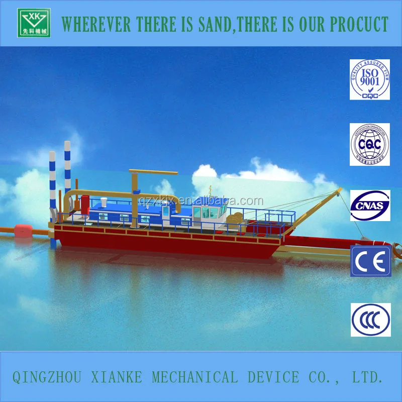 First the hydraulic cutter in the ladder dredges clay below water, then dredged sand moved by the rotated cutter mixes with water and form liquid medium.Then the sand liquid in the inner cutter blade and beside the marine pump suction functioned by the fluid power of sand pump, enters sand pump, meanwhile, get some energy,at last, it is discharged to the destination through discharge pipe.