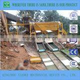 Using excavator to feed raw material to the hopper ,then, they flow into the trommel, big stones and pebble can be separated and flow outside of the equipment, mineral aggregate with gold whose diameter is less than 6mm can enter into the beneficiation sluice through inner trammel screen, there is a fixed and high extraction ratio gold felt sluice in one side of the beneficiation sluice to extract gold particle. The machine is equipped with big flow capacity and big head water pump, can supply high pressure water for hopper, trammel, the mineral aggregate with gold will flow through the gold felt in the effect of self weight and waterpower, lighter mud or sand will be washed away and big specific gravity gold is left on the gold felt.