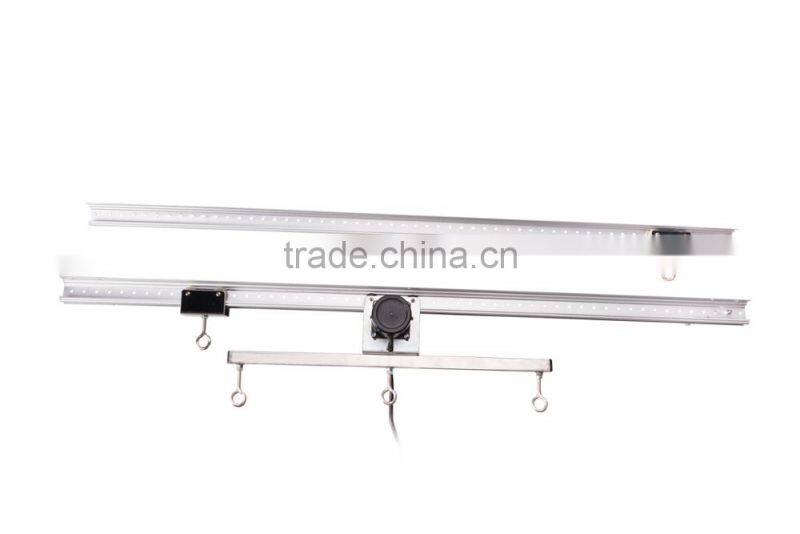 Our light mover operates with a 3.5 drive motor, comes with two units 110cm/43inch rail tracks. It uses no pulleys, chains or gears,just simply mount the rail to your ceiling and place the drive motor onto the track. Then ready to hang your reflector to motor open hanger, plug it in and now