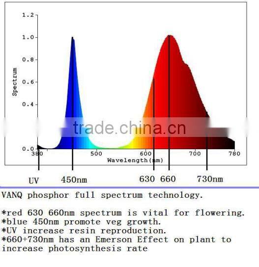 It produces a broad spectrum light combined with intensified red, blue, near-UV and IR to provide the full spectrum plants need to thrive and not just grow. our spectrum heavily focuses on deep red (660nm) and royal blue (450nm) which are optimal colors for plant growth. We only supply enough Green, Yellow and Orange light to keep plants happy and healthy.