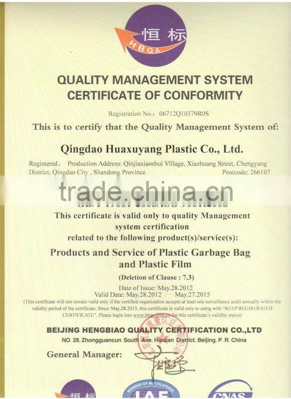 Our company was founded in 2000, located in the beautiful coastal city Qingdao. Our company specializies in producing ,operating, and exporting all kinds of plastic bags, plastic films with different specifications, different materials(such as LDPE, HDPE LLDPE, BOPP, PVC,PVA and so on ). The main items are Draw String Garbage Bags, T-shirt bags, Bags on rolls, Handle Bags, Die-cut Bags, Garment Bags, Industrial Rejectamenta Dedicated Garbage Bags, Flat Bags, covering membrane , Protection Film, various of biodegradable bags ,Water-Solubility Environmental Protection Bags, Agricultural Mulching Film, Garden Mulching Film , Mulching perforated Film, and Shrink Film and so on . Our annual production capacity is 3,000 tons.