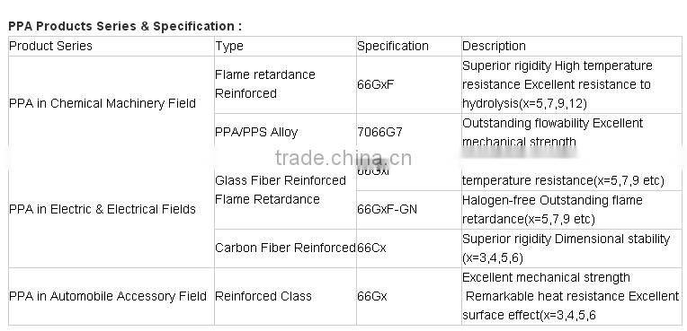 PPA (Polyphthalamide) phthalic amide, under high temperature and high humidity condition, the tensile strength of PPA 20% higher than that of nylon 6, nylon 66 is higher;PPA bending modulus is 20% higher than the nylon material, hardness is larger, can long time tensile creep resistance;PPA and the ability of resistance to gasoline, oil and coolant is stronger than the PA;A kind of high temperature resistant nylon, this material can be resistant to continuous high temperature 200 ℃, and it also can keep good dimensional stability.