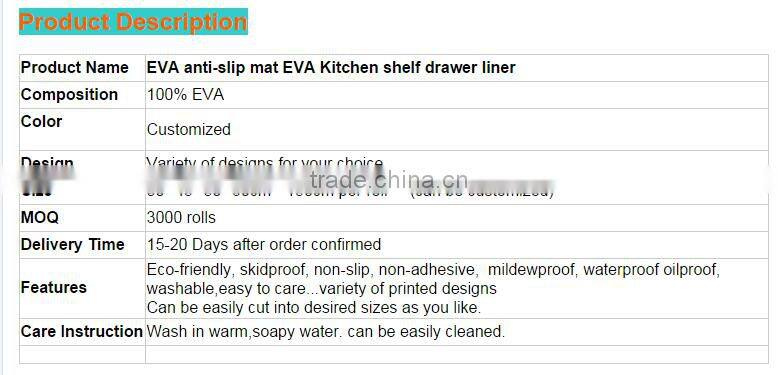 Anti-slip place mat made of 100%EVA,available in different pattern,designs,shapes and sizes. Place mats can be used to protect the dinning table from dirt, dust, wateras as well as a small piece of decorative item beautify your dinning table.