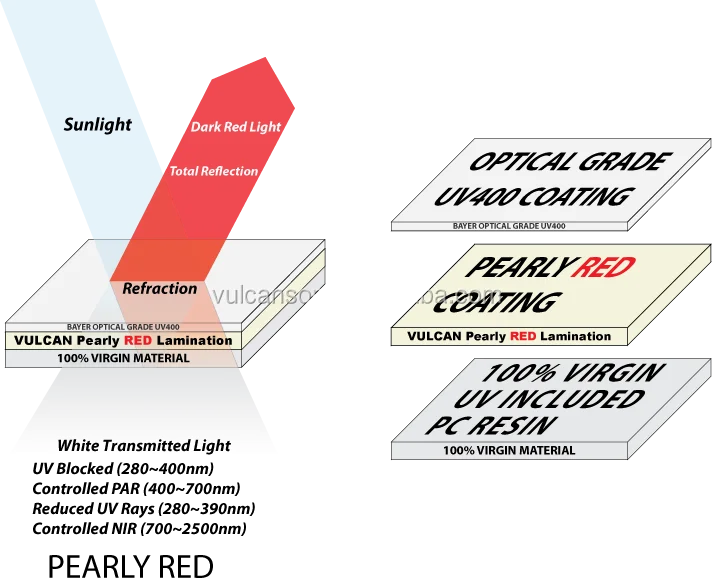 VULCAN Polycarbonate Corrugated and Solid Pearly RED sheets have an eye catching Reddish / Greenish Hue, and is specially designed for plants and vegetation. The special Pearly RED pigment filters out unwanted far Infrared and keeps the near red light which plants need for better growth.