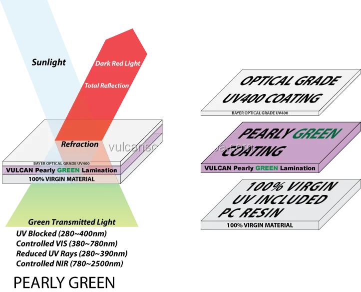 VULCAN Polycarbonate Pearly GREEN sheet has a Lilac / Greenish Hue, and creates a significant drop in temperature (Depending on the individual application conditions, rooms are up to 15°c cooler compared to non-pigmented systems), owing to its ability to block harmful UV and IR rays. Since Pearly GREEN was specially designed for humans and living organisms, and focuses more on it's cooling abilities.