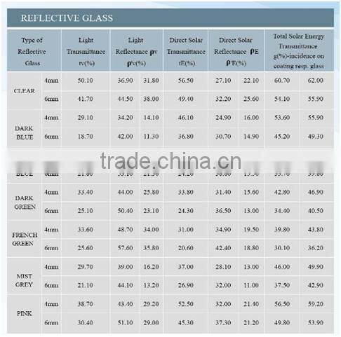 Heat reflective glass is generally coated in the glass surface layer or layers of metals such as chromium, titanium or stainless steel or its compound composition of the film, the product was rich in color, for the visible light have appropriate transmittance, the infrared has a higher Reflectivity, high absorption of ultraviolet light, therefore, also known as solar control glass, mainly for construction and glass curtain wall; low-e glass is coated in the glass surface by the multi-layer silver, copper or tin and other metals or compounds Of the film system, the product has a higher transmittance of visible light, the infrared has a high reflectivity, with good insulation properties, mainly for construction and automobiles, ships and other means of transport, due to poor film strength, the general Are made of insulating glass; Conductive film glass is coated in the glass surface of indium tin oxide conductive film, can be used for glass heating, defrosting, defogging and as a liquid crystal display.