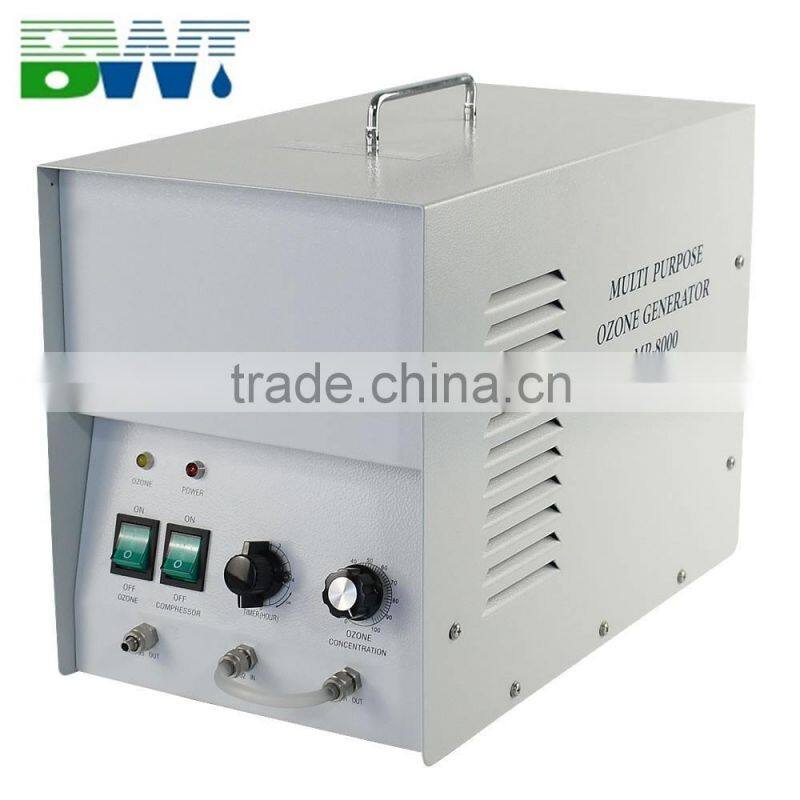 The MP-8000 is equipped to take ambient air or oxygen from a tan or an oxygen generator. It comes with a built in air compressor for optimum ozone output and a heavy duty fan or circulation during air applications. It has a timer to shutoff automatically or it can run continuously.