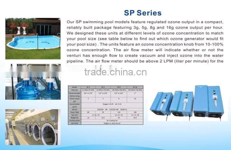 The Swimming pool series ozone generator model SP series is a compact, regulated output with Corona Discharge (CD Type) ozone cell with 3g/h, 5g/h, 8g/h, 16g/h of ozone output. The units are air-cooled, robustly built and reliable. They produce ozone concentration between 3 to 16g/hr. The components are made of high quality material and the controls are easy to use and view. The units feature ozone concentration knob to control ozone from 10~100% concentration. Use the AMP Meter to see any possible defaults. Observe the Air Flow meter if venturi has enough flow to create vacuum and inject ozone into water pipe line. The Air Flow meter should be above 2 LPM for the proper amount of Suction.