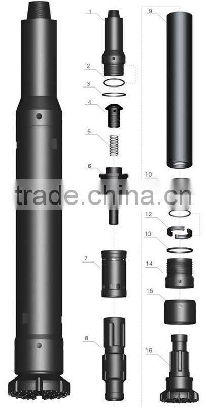 1. Top Sub 2. O Ring of Top Sub 3. Breakout Ring 4. Check Valve 5. Spring 6. Air Distributor 7. Internal Cylinder 8. Piston 9. External Cylinder 10. Guided Sleeve 11. o Ring of Stop Ring 12. Stop Ring 13. Breakout Ring 14. Drive Chuck 15. Retainer 16. Drill Bit | 800.00 0.02 3.55 13.5 0.35 58.9 101.6 517.0 952.0 98.0 0.02 14.25 3.55 162.0 50.00 528.00 | ND475A01 ND475A02 ND475A03 ND475A04 ND475A05 ND475A06 ND475A07 ND475A08 ND475A09 ND475A10 ND475A11 ND475A12 ND475A13 ND475A14 ND475A15 ND475A16 |