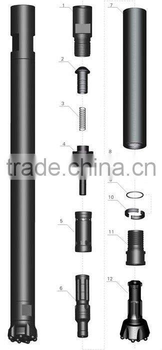 1. Top Sub 2. Check Valve 3. Spring 4. Air Distributor 5. Internal Cylinder 6. Piston 7. External Cylinder 8. Guided Sleeve 9. o Ring of Stop Ring 10. Stop Ring 11. Drive Chuck 12. Drill Bit | 1.70 0.01 0.05 0.80 0.80 1.20 4.00 0.15 0.05 0.10 0.80 1.70 | NBR101 NBR102 NBR103 NBR104 NBR105 NBR106 NBR107 NBR108 NBR109 NBR110 NBR111 NBR112 |