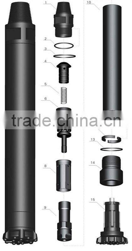 1. Top Sub 2. O Ring of Top Sub 3. Breakout Ring 4. Check Valve 5. Spring 6. Air Distributor 7. Internal Cylinder 8. Piston 9. External Cylinder 10. Guided Sleeve 11. o Ring of Stop Ring 12. Stop Ring 13. Breakout Ring 14. Drive Chuck 15. Drill Bit | 59.00 0.03 0.50 1.40 0.30 10.50 12.50 77.00 110.00 4.50 0.02 1.90 0.50 25.50 106.00 | NN100A01 NN100A02 NN100A03 NN100A04 NN100A05 NN100A06 NN100A07 NN100A08 NN100A09 NN100A10 NN100A11 NN100A12 NN100A13 NN100A14 NN100A15 |