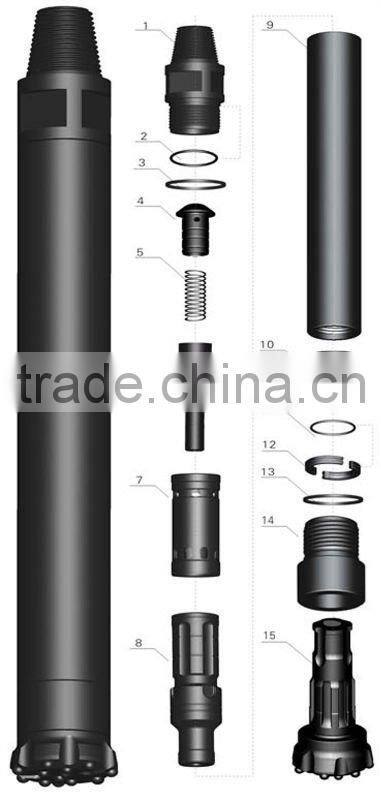 1. Top Sub 2. O Ring of Top Sub 3. Breakout Ring 4. Check Valve 5. Spring 6. Air Distributor 7. Internal Cylinder 8. Piston 9. External Cylinder 10. Guided Sleeve 11. o Ring of Stop Ring 12. Stop Ring 13. Breakout Ring 14. Drive Chuck 15. Drill Bit | 34.00 0.015 0.30 1.20 0.10 6.00 6.50 42.50 59.00 6.00 0.01 1.20 0.30 16.00 37.00 | NSD8A01 NSD8A02 NSD8A03 NSD8A04 NSD8A05 NSD8A06 NSD8A07 NSD8A08 NSD8A09 NSD8A10 NSD8A11 NSD8A12 NSD8A13 NSD8A14 NSD8A15 |