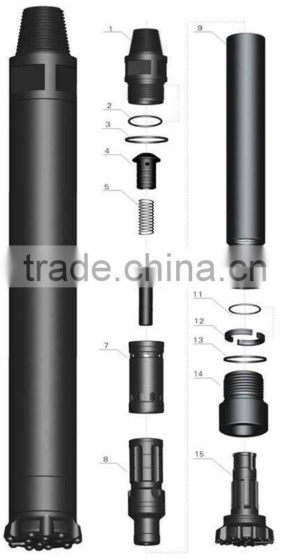 1. Top Sub 2. O Ring of Top Sub 3. Breakout Ring 4. Check Valve 5. Spring 6. Air Distributor 7. Internal Cylinder 8. Piston 9. External Cylinder 10. Guided Sleeve 11. o Ring of Stop Ring 12. Stop Ring 13. Breakout Ring 14. Drive Chuck 15. Drill Bit | 59.00 0.03 0.50 1.40 0.30 10.50 12.50 77.00 110.00 11.50 0.01 1.50 0.50 31.50 108.00 | NSD10A01 NSD10A02 NSD10A03 NSD10A04 NSD10A05 NSD10A06 NSD10A07 NSD10A08 NSD10A09 NSD10A10 NSD10A11 NSD10A12 NSD10A13 NSD10A14 NSD10A15 |
