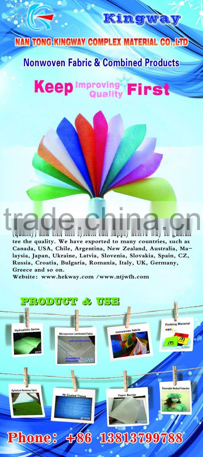Nantong Kingway Complex Material CO., Ltd (Nantong Hekway Building Material CO., Ltd) is a leading professional manufacturer in Chin... Nantong Kingway Complex Material CO., Ltd (Nantong Hekway Building Material CO., Ltd) is a leading professional manufacturer in China, which locates in Haian State-grade Development Zone, Nantong City, Jiangsu Province, nearby Shanghai. We have advanced production lines with the technology from Italy and Germany, which are applied to nonwoven products, film lamination, roofing materials, disposable medical products, packaging materials and so on. Main products: Nonwoven fabric , SMS, SMMS and manufactured products Film or foil laminated products Roofing membrane, flooring underlay PE woven fabric, PE tarpaulin, vapor barrier Greenhouse We not only have first-class processing line, but have first-grade quality management. We have been qualified by ISO9001 (quality) and CE, this system can supply active way to guarantee the quality. We have exported to many countries, such as Canada, USA, Chile, Argentina, New Zealand, Australia, Malaysia, Japan, Ukraine, Latvia, Slovenia, Slovakia, Spain, CZ, Russia, Croatia, Bulgaria, Romania, Italy, UK, Germany, Greece and so on. With a group of excellent senior management and hi-tech R& D personnel and our skilled workers, we can supply you the goods with competitive prices and better quality. We look forward to establish friendly and long term relationship with you in the near future. | ||