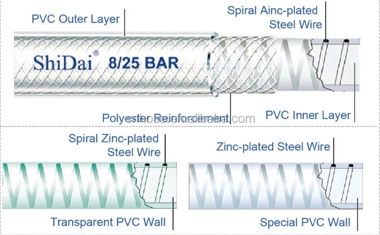 This hose, with steel wire screwing inlaid in the hose, is light, transparent, with small bending radius. It has good adaptability to hard weather conditions and minus pressure.