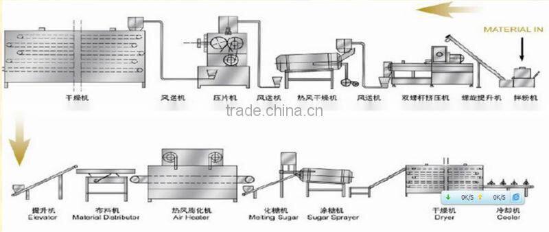Mixer---extruder---vibrate cooler---air conveyr---rollers drying machine---flaking machine---air conveyor---roasting oven---high temperature oven---second vibrate cooler---sugar spayer--- multi-layer oven---cooling