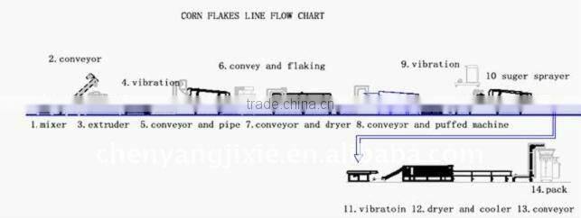 Mixer---extruder---vibrate cooler---rollers drying machine---flaking---air conveyor--- roasting---high temperature inflate---second vibrate cooler---sugar caoting machine---multi-layer oven---cooling--packing