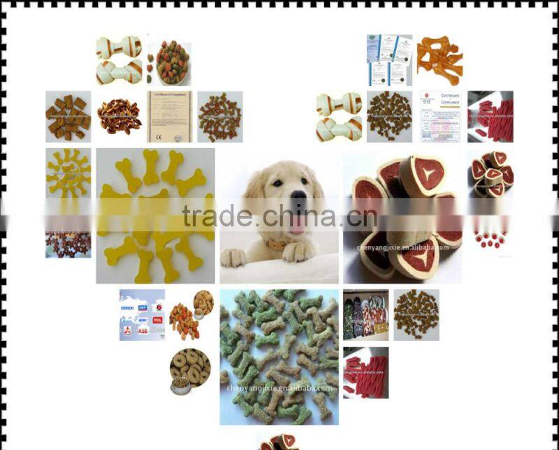 * Dog chewing food machine can make dog chewing food is made of many kinds of different materials with scientific configuration and extrusion in the extruder. This kind of product can be made into a variety of shapes such as stick, bone, etc. This kind of food not only provides nutrition to dogs, like protein, fat, vitamin, etc, but also satisfies the dog nature hobby, benefits its strong teeth, cleans mouth and teeth, and prevents disease.