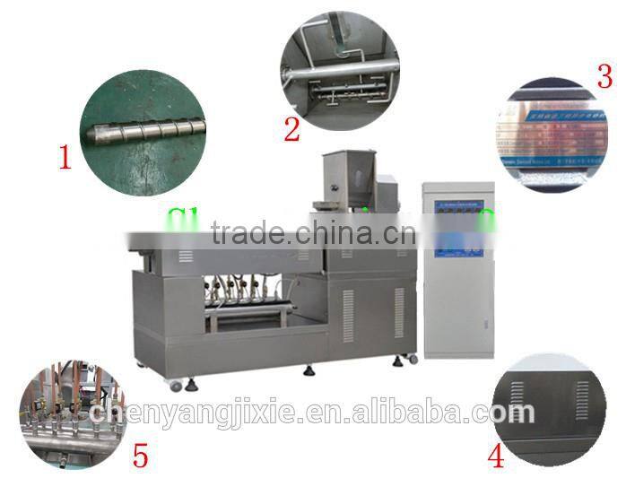 Mixer---screw conveyor---double screw extruder CY65-II---cutting machine---three layers electrical roasting oven--- frying system--- automatic flavoring line--- packing line