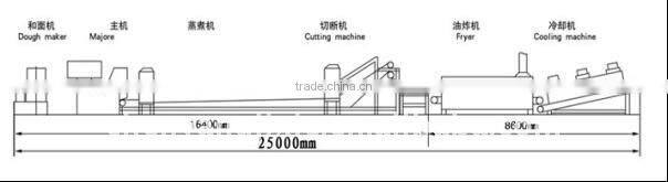 Dough maker----Roller pressing machine---Bolling machine---Cutting machine---Electric fryer---Cooling machine---packing