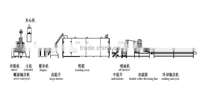 Mixer---Screw conveyor---extruder--Elevator---Cooling machine---Shaking machine---fryer---Automatic flavoring machine --cooling machine