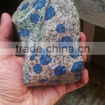 K2 granite cuts, tumbles, and polishes beautifully. Due to its high feldspar content, it can be easily cut with a lapidary saw and shapes quickly on a diamond wheel. Although azurite has a Mohs hardness of 3.5 to 4, the blue dots have the same cutting and polishing properties as the surrounding white granite. This is because the azurite exists as a stain rather than as discrete mineral grains.