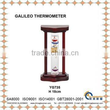 Galileo Thermometers are magnificent creations that make Galileo's 400 year old principle of relative density a functional reality. An accurate indoor thermometer encased in brilliant glass, the Galileo is the point at which art meets science. Galileos add sparkle and focus to any setting: Galileos are precisely manufactured. Each of the liquid-filled floats weighs grams more than the one above it in the cylinder to ensure a stately and orderly procession of ups and downs as the temperature changes. To accomplish this balancing, the tags on which the temperature is marked are attached by hand. The fluid in the floats and the cylinder has to be exactly the same density for the thermometer to function properly. The fluid is non-toxic and non-hazardous, an inert oil/hydrocarbon mixture like mineral oil: Galileos are carefully packaged. The cylinder walls are laboratory grade glass, so sturdiness isn't an issue. A four-color cardboard box sleeve surrounds a form-fitted foam case that virtually guarantees safe arrival: This fascinating, functional instrument is the point at which science meets art. Four hundred years ago Galileo discovered that specifically weighted floating bubbles would predictable rise or sink in a liquid as the temperature of that liquid is changed. These decorative glass reproductions of Galileo's discovery have glass floats precisely weighted 6 gram increments suspended in a clear, environmentally safe, non-toxic liquid. Our products have high quality and we are certified by ISO9001 and SA8000 and be inspected by Wal-mart. Our products have various kinds and size which can satisfied all your needs. Also, its design are very novelty and special. Our material is High Borosilicate Glass, its quality is very high.