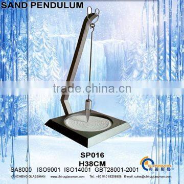 Galileo began his study of the pendulum while, according to legend, he watched a suspended lamp swing back and forth in the cathedral of Pisa. In an ingenious way the Sand Pendulum takes this scientific principle (a weight mounted so that it can swing freely under the influence of gravity) to create fantastic designs on sand. Each design will be unique and beautifully scaped into sand.