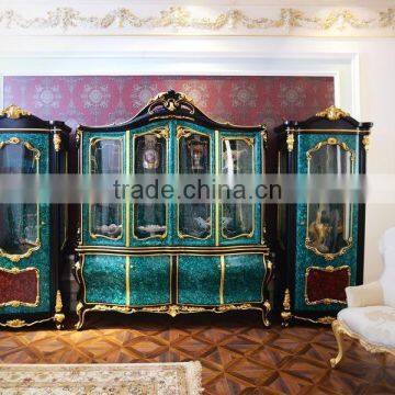Antique Rococo Peacock Green Living Room Glass Display Cabinet/ Latest Design Decorative Wooden 4-Door Wine Cabinet
