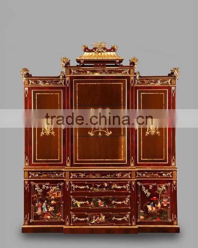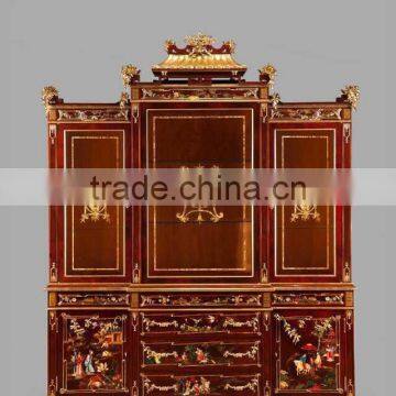 Antique Hand Carved Classic Curio Cupboard Inlaied Seasell Mosaic, Gold Gilding Wooden Display Cabinets With Flowers Paint Motif