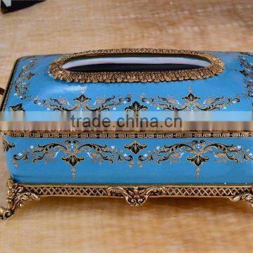 New Design Noble Appliance Blue Ceramic Floral Painting Brass Decorative Tissue Box
