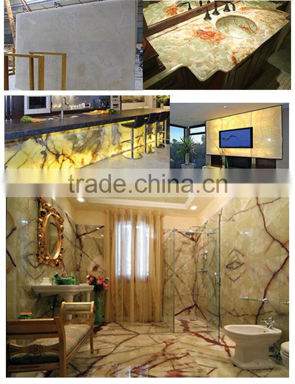 Newstar polished honey yellow onyx are hot in floor and wall decorate. During the past year, we have supplied for many projects in different countries like USA, UK,Europe ect. Now it's more and more popular for decoration ,like TV background,Hotel lobby, shop,ect. We hope we could help to catch the market.