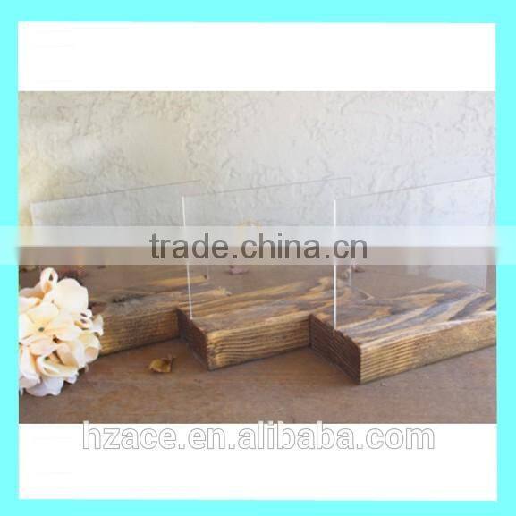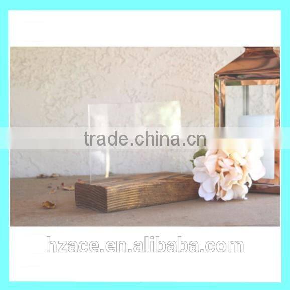 A wood base (approx. 7.5" long and 3.5" wide) with a 5"x7" acrylic place card. Customized size is welcomed.