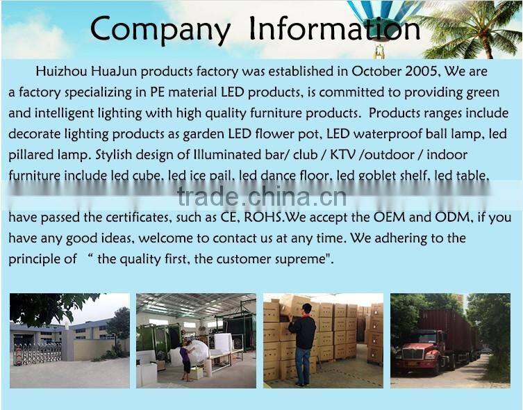 2. Q: How many kinds of products in your factory ? A: we have a large range of products, led table, led chair/stool/sofa, ice bucket, led lamp, bar counter, flower pot, other decors,..